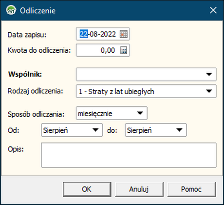 2. W oknie Odliczenie uzupełnić: