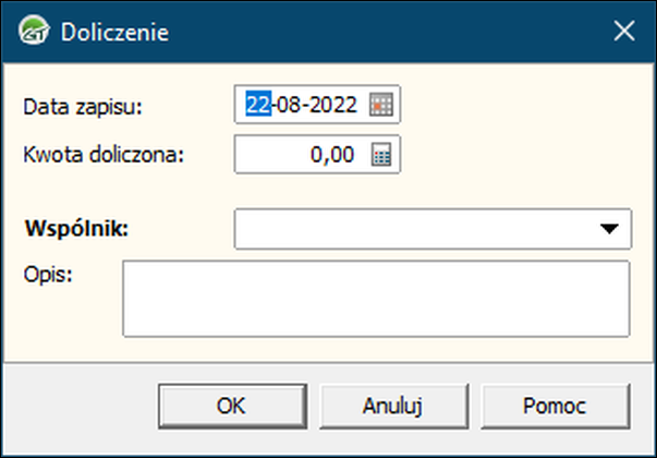 Odliczenie i doliczenie do ewidencji przychodów można dodawać zarówno z poziomu Ewidencji przychodów jak i ewidencji odliczeń i doliczeń. Niezależnie od wybranej metody, skutkiem końcowym będzie utworzenie wpisu w Ewidencji odliczeń i doliczeń, w ewidencji przychodów pozycja ta nie będzie widoczna. Aby utworzyć odliczenie/doliczenie z modułu ewidencji odliczeń i doliczeń należy: