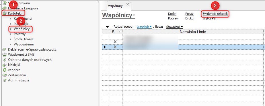 1. Przejść do modułu Kartoteki  Wspólnicy, a następnie otworzyć Ewidencję składek.