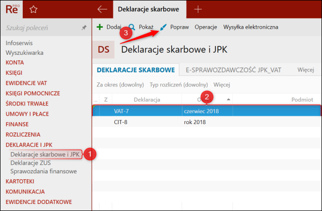 1. Przejść do modułu Deklaracje skarbowe i JPK, zaznaczyć wyliczoną deklarację, następnie z górnego menu wybrać Popraw.