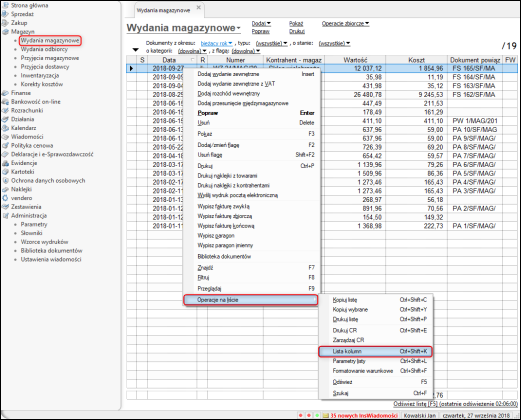 1. Zalogować się na konto użytkownika, którego widok ma zostać ograniczony, a następnie w modułach magazynowych, np. Wydania magazynowe, kliknąć liście prawym przyciskiem myszy i wybrać Operacje na liście – Lista kolumn.