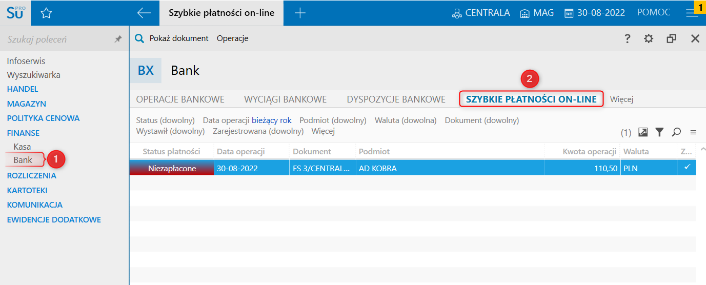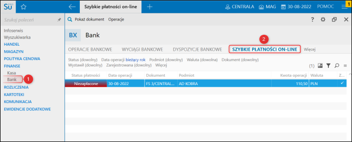 ​Każdy dokument, który płatny jest formą płatności typu Szybka płatność, widoczny jest w widoku Szybkie płatności on-line dostępnym w module Bank.
