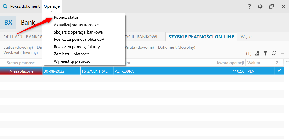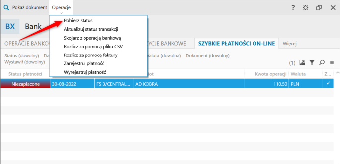 Aby sprawdzić, jaki jest aktualny status płatności on-line za dokument, należy skorzystać z górne menu i opcji Pobierz status. Tylko ta operacja powoduje zmianę statusu transakcji.