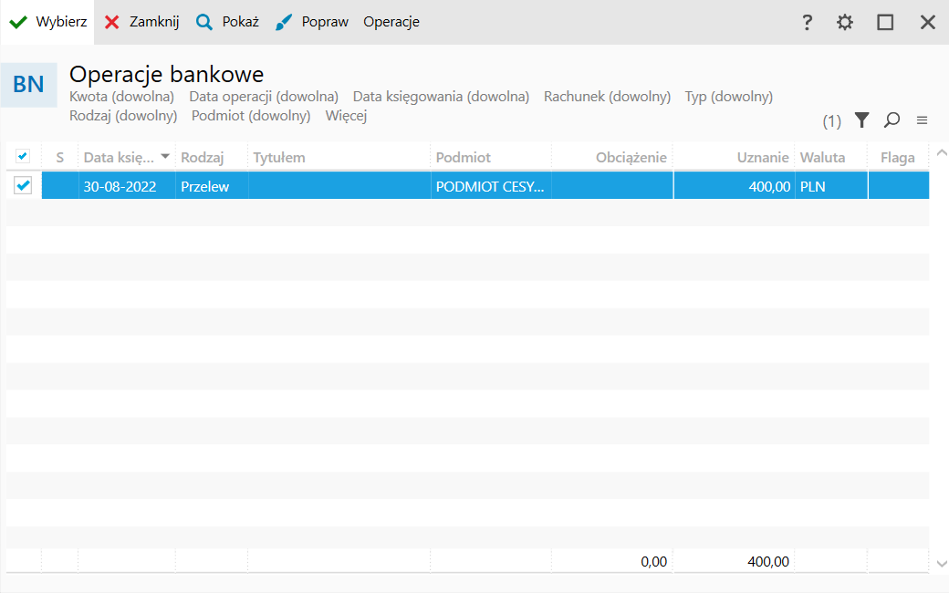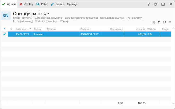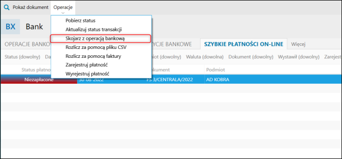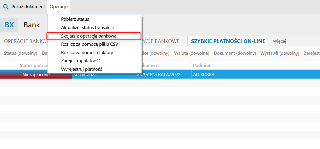 W górnym menu znajduje się także przycisk Skojarz z operacją bankową. Pozwala on na skojarzenie opłaconej transakcji z wpłatą dokonaną przez podmiot obsługujący płatności on-line.