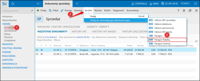 1. Przejść do modułu Sprzedaż, następnie z górnego menu Korekta wybrać Dodaj do nieistniejącego dokumentu typu – Paragon fiskalny.