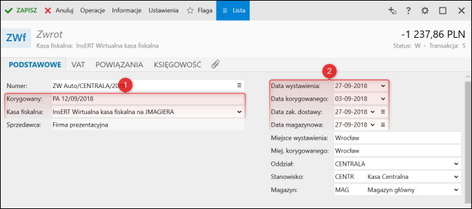 2. W oknie edycji dokumentu uzupełnić numer dokumentu korygowanego, kasę fiskalną oraz jego datę.