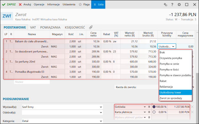 3. Uzupełnić specyfikację towarową, przyczynę korekty oraz wybrać odpowiednią formę płatności.