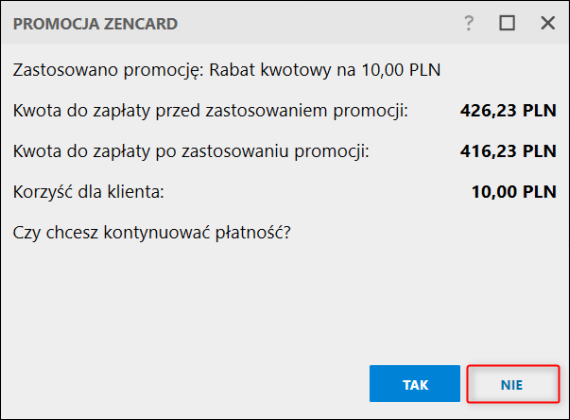 1. W oknie Promocji ZenCard kliknąć Nie.