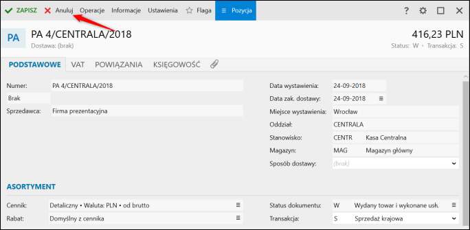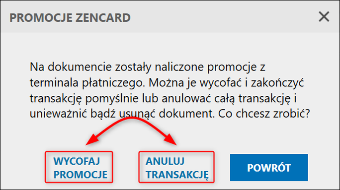 3. Określić, czy Wycofać promocję i pomyślnie zakończyć transakcję, czy Anulować transakcję i unieważnić bądź usunąć dokument (konfiguracja domyślnego działania promocji została opisana w oddzielnym artykule dostępnym tutaj).