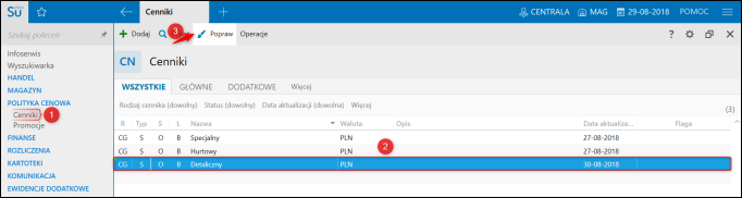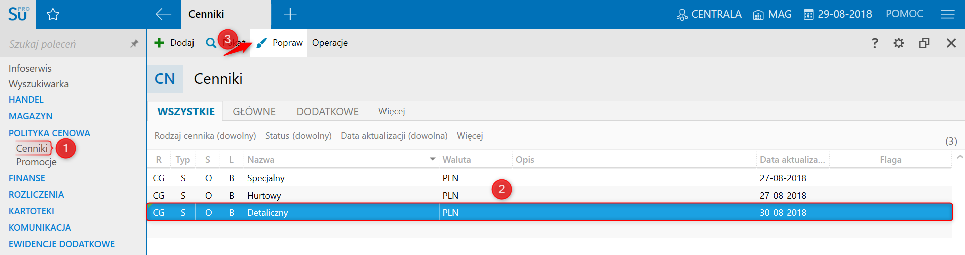 1. Przejść do modułu Cenniki, zaznaczyć cennik, któremu zostanie ustawione zaokrąglanie i kliknąć górne menu Popraw.
