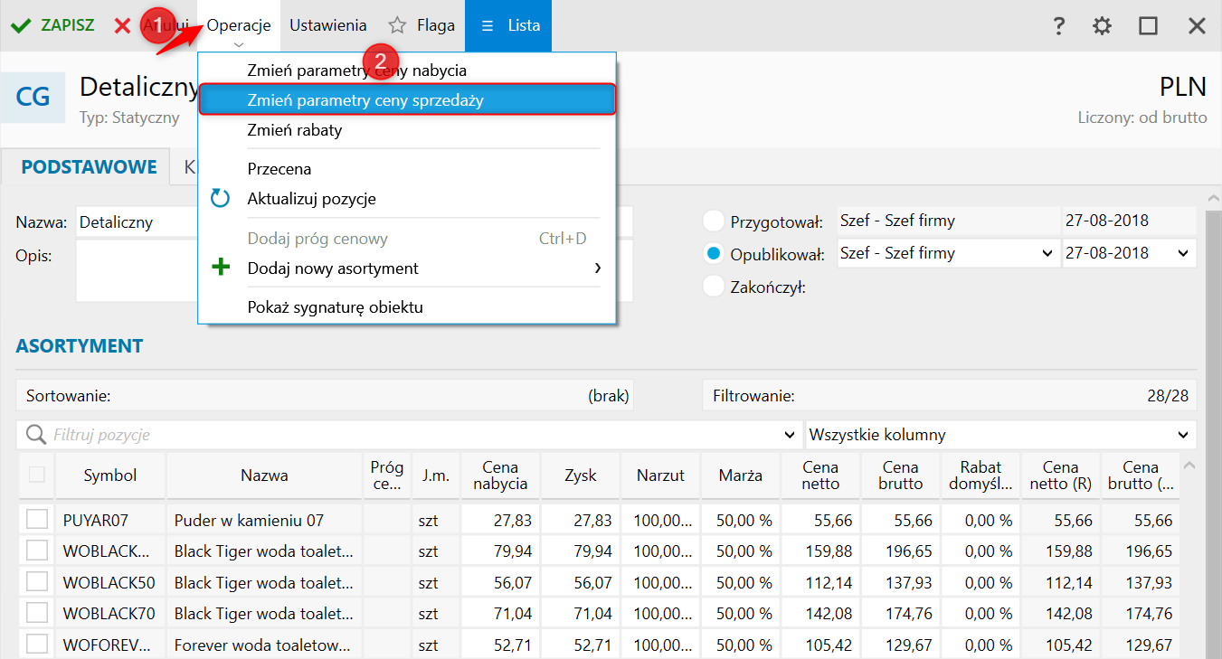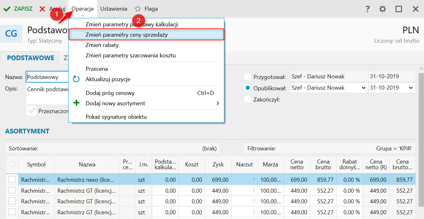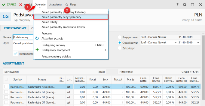 3. Rozwinąć górne menu cennika Operacje i wybrać Zmień parametry ceny sprzedaży.