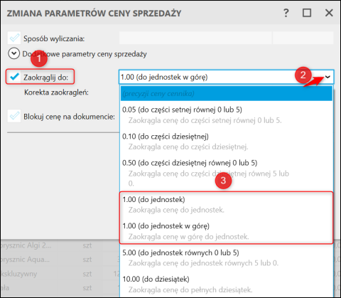 - 1.00 (do jednostek w górę) – opcja, podobnie jak powyższa, zaokrągla kwotę do pełnej złotówki, jednakże zawsze w górę (1.01 zł zostanie zaokrąglone do 2 zł).