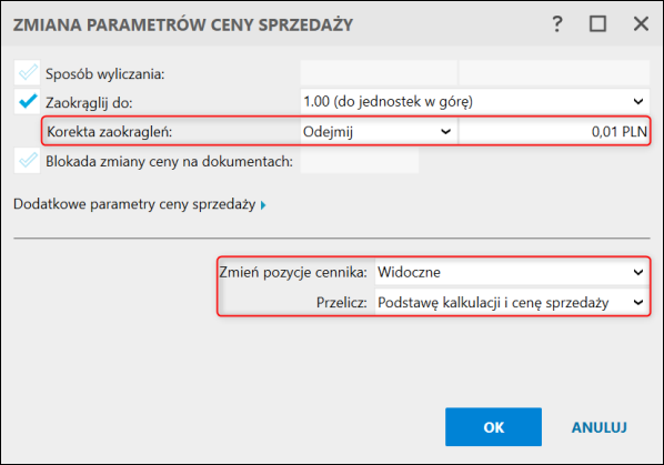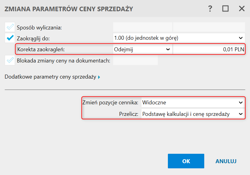 4. W polu Korekta zaokrągleń ustawić Odejmij, wpisać kwotę 1 grosza (0,01 PLN), w polu Przelicz zaznaczyć Cenę sprzedaży, a w polu Zmień pozycje cennika wybrać, czy zmiana ma dotyczyć: