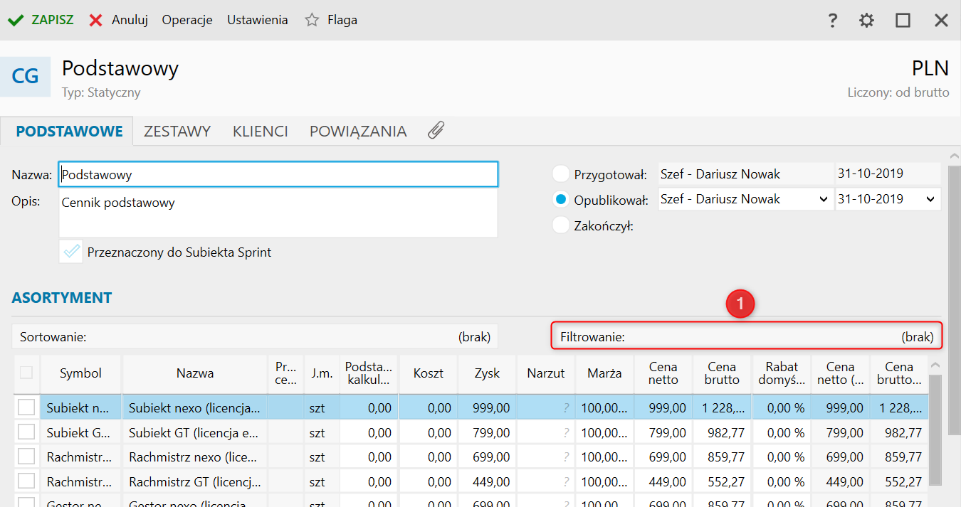 - Wszystkie – Wszystkie towary, które są na tym cenniku.