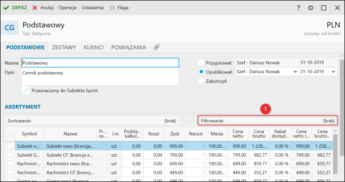 1. Podobnie jak w pierwszym przykładzie, należy otworzyć Cennik poprzez kliknięcie górne menu Popraw modułu Cenniki i kliknąć Filtrowanie.