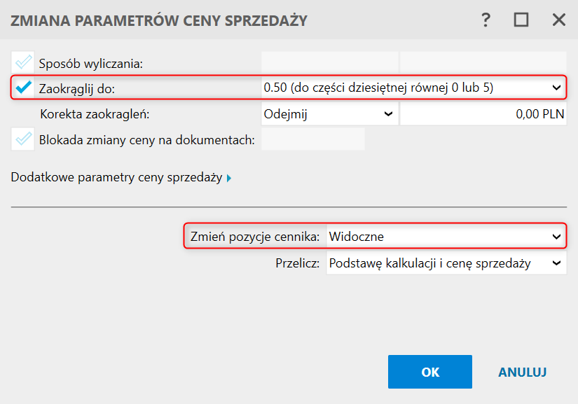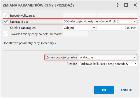 Ważne jest, żeby zwrócić uwagę na opcję Zmień pozycje cennika, która w tym przypadku powinna być ustawiona na Widoczne. Dzięki takiemu zaznaczeniu nowe parametry wyliczania ceny sprzedaży będą zastosowane jedynie do widocznych, wcześniej przefiltrowanych pozycji.