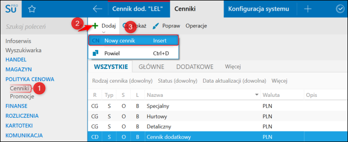 1. Przejść do modułu Cenniki, rozwinąć górne menu Dodaj i wybrać Nowy cennik.