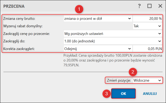 Najważniejszym punktem w oknie Przecena jest Zmień pozycje, które w tym przypadku obowiązkowo musi być ustawione na Widoczne. Oznacza to, że Przecena zostanie zastosowana jedynie do wcześniej przefiltrowanych pozycji.