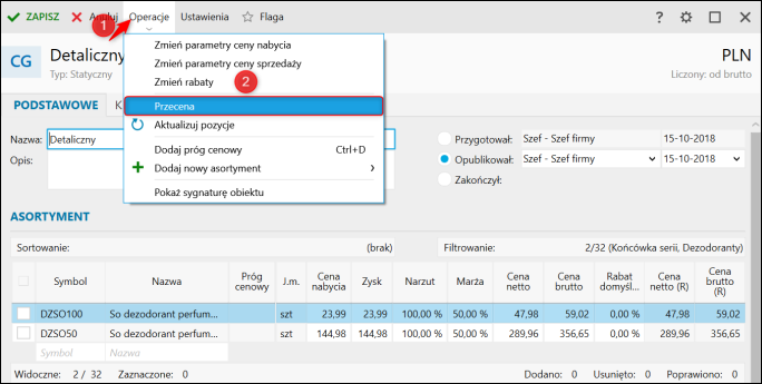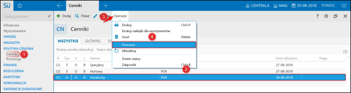 3. Po utworzeniu Cennika dodatkowego otworzyć go rozwinąć górne menu Operacje i wybrać Przecena.