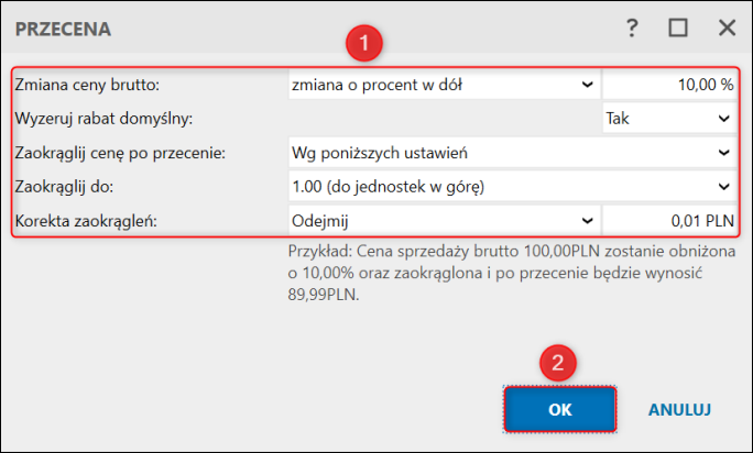 4. Określić parametry Przeceny i zatwierdzić przyciskiem OK.