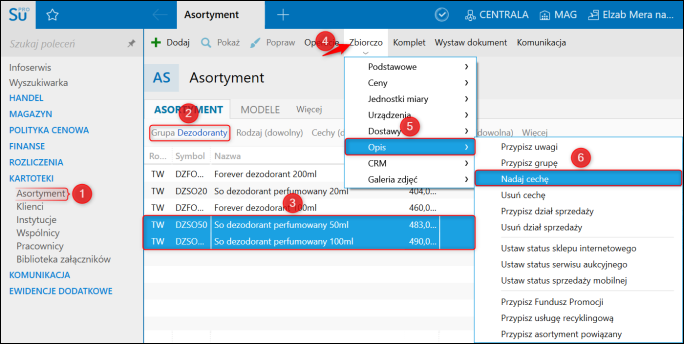 1. Przejść do modułu Asortyment, przefiltrować listę w taki sposób, aby pokazywała asortyment z określonej grupy, zaznaczyć odpowiednie produkty, którym zostanie przypisana cecha Końcówka serii, rozwinąć górne menu Zbiorczo, kliknąć Opis i wybrać Nadaj cechę.