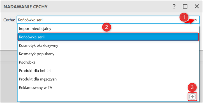 2. Z listy rozwijalnej okna Nadawanie cechy wybrać wcześniej utworzoną cechę Końcówka serii i zatwierdzić przyciskiem OK. W razie braku cechy można dodać ją z tego samego poziomu, klikając w obrazek Plusa.