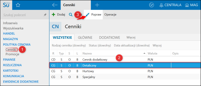 3. Przejść do modułu Cenniki, zaznaczyć Cennik i kliknąć górne menu Popraw.