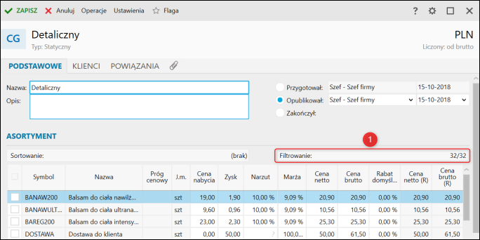 Jeśli w trakcie tworzenia Cennika dodatkowego nie został określony asortyment z grupy Dezodoranty, można przefiltrować listę asortymentu (punkty 4 i 5 w przykładzie pierwszym).