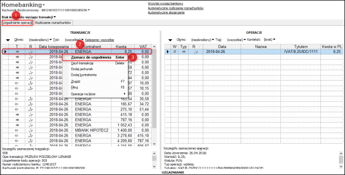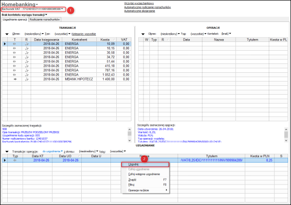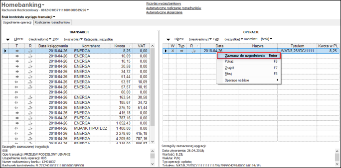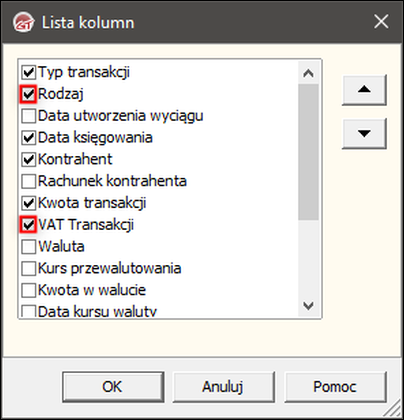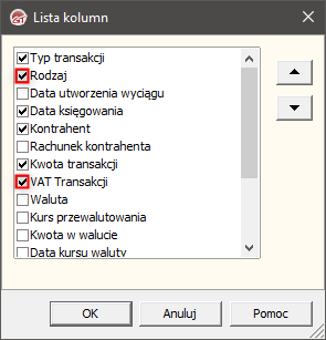 1. Dla łatwiejszego identyfikowania operacji włączyć kolumny Rodzaj i VAT transakcji. Aby to zrobić, należy w module Homebanking, w tabeli Transakcje znajdującej się po lewej stronie kliknąć prawy przycisk myszyOperacje na liście – Lista kolumn i zaznaczyć kolumny Rodzaj oraz VAT Transakcji.