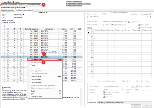 3. W zakładce Rozliczanie rozrachunków, będąc ustawionym na kontekście rachunku rozliczeniowego, zaznaczyć operację Podzielona płatność (dwie strzałki z literami PP w kolumnie R, taka operacja będzie miała kwotę również w kolumnie VAT), kliknąć prawy przycisk myszy i wybrać Zaznacz/Edytuj.