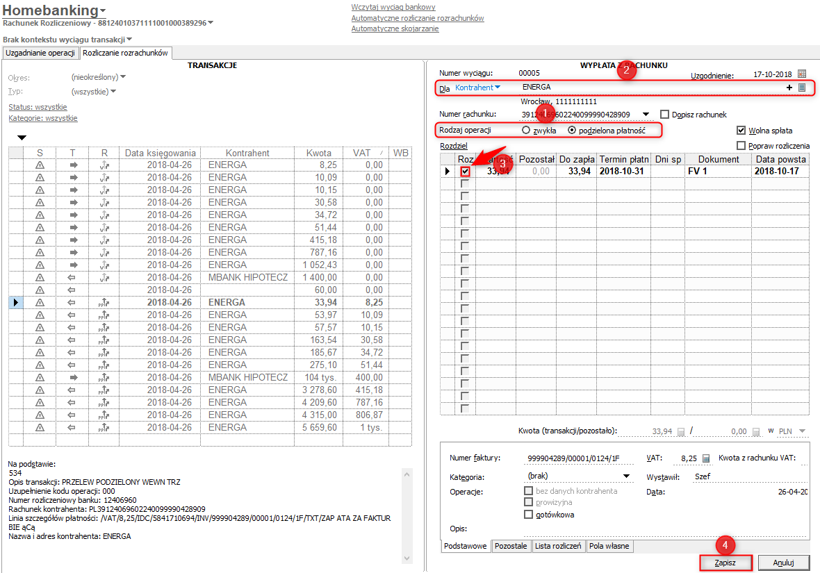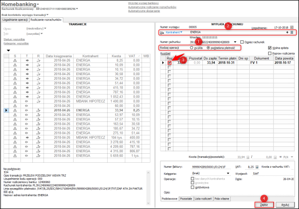 4. Rodzaj tworzonej operacji w tabeli Wpłata/Wypłata z rachunku (po prawej stronie) powinien być automatycznie ustawiony jako podzielona płatność. Tutaj należy zapisać tę operację w programie, przypisując na przykład kontrahenta, i klikając przycisk Zapisz.