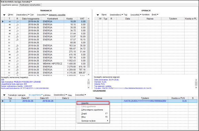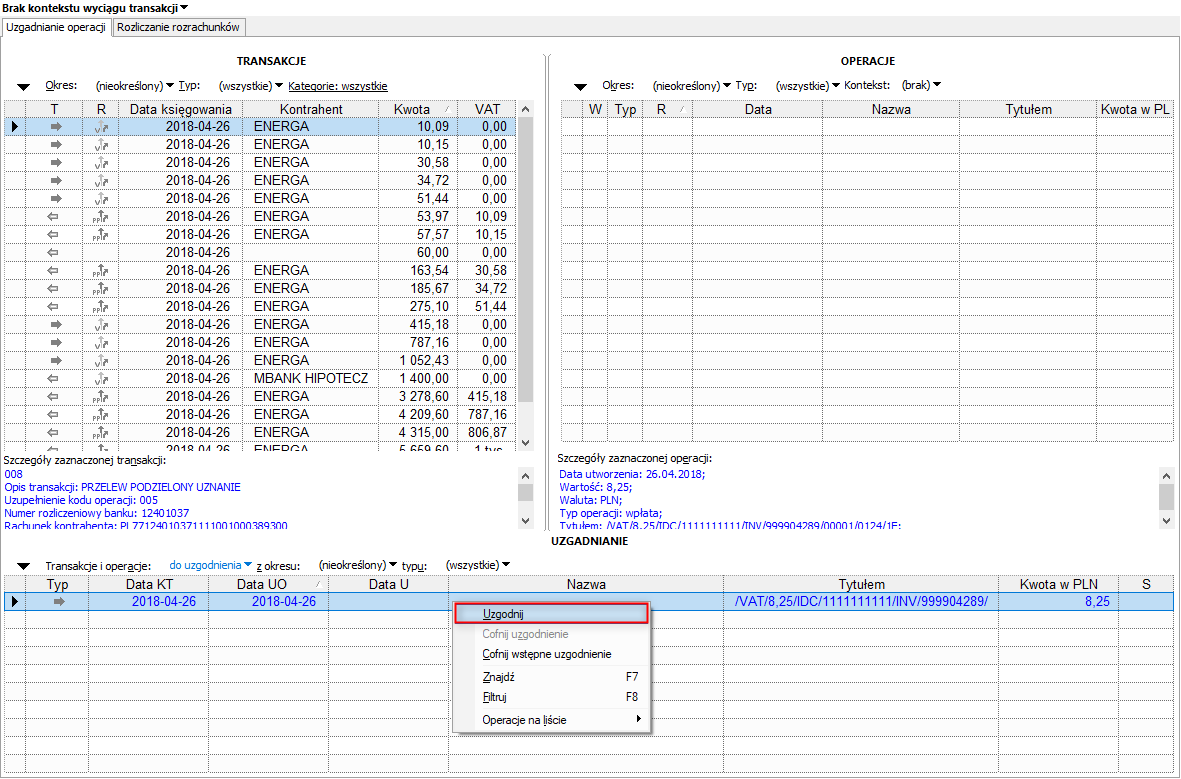7. Te dwie operacje zostaną wstępnie uzgodnione. Aby  dokończyć tę czynność, należy w dolnej tabeli kliknąć powiązanie prawym przyciskiem myszy i wybrać opcję Uzgodnij.