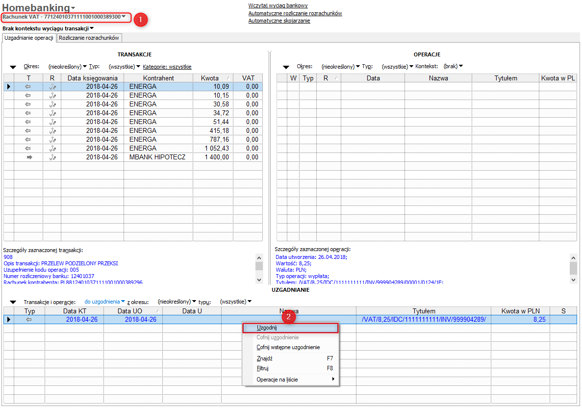 9. Zmienić kontekst na rachunek VAT i uzgodnić operację VAT z transferem VAT, analogicznie jak w punktach od 5 do 8.
