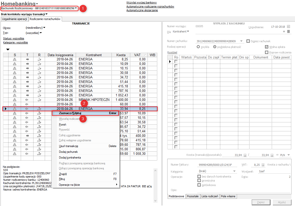 3. W zakładce Rozliczanie rozrachunków, będąc ustawionym na kontekście rachunku rozliczeniowego, zaznaczyć operację Podzielona płatność (dwie strzałki z literami PP w kolumnie R, taka operacja będzie miała kwotę również w kolumnie VAT), kliknąć prawy przycisk myszy i wybrać Zaznacz/Edytuj.