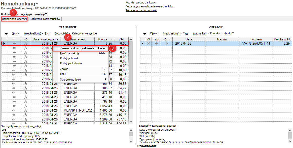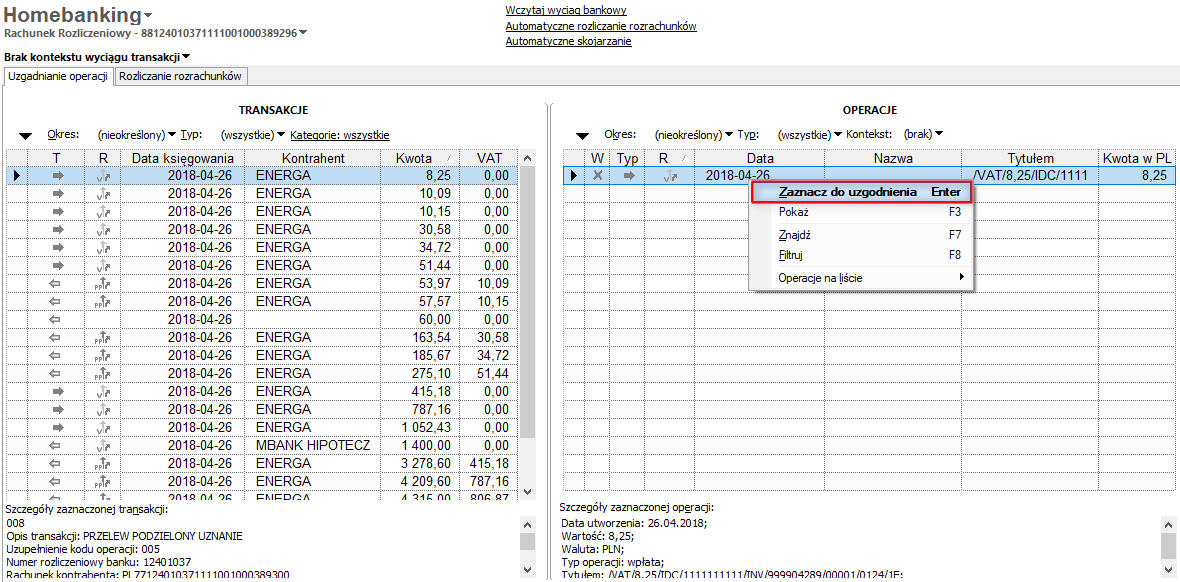 5. Oprócz operacji typu podzielona płatność na wczytanym przez plik wyciągu znajduje się operacja typu VAT (dwie strzałki z literą V w kolumnie R, a w kolumnie VAT wartość 0). Należy ją powiązać z transferem VAT powstałym w wyniku wykonania punktu 4. tego poradnika. Aby to zrobić, należy przejść do zakładki Uzgadnianie operacji, w kolumnie Transakcje po lewej stronie zaznaczyć operację o rodzaju VAT i klikając prawy przycisk myszy wybrać na niej opcję Zaznacz do uzgodnienia.