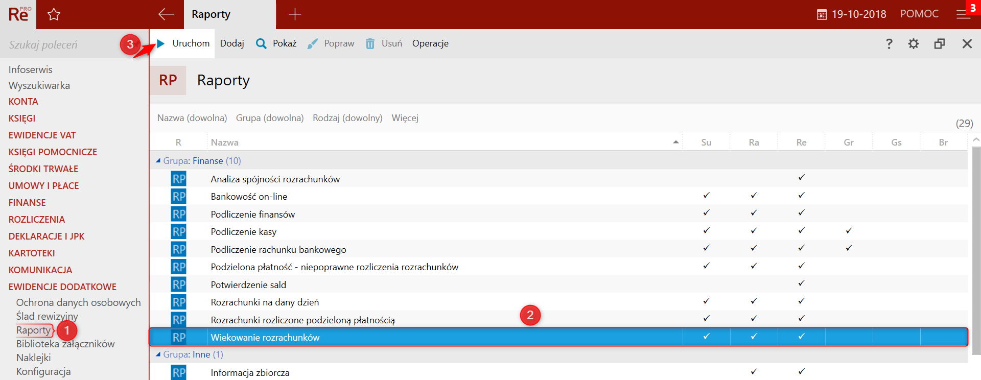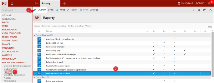 1. Przejść do modułu Raporty, zaznaczyć Wiekowanie rozrachunków i kliknąć górne menu Uruchom.