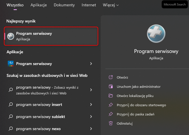 1. Zamknąć działające programy InsERT GT, a następnie uruchomić Program serwisowy (w Windowsie 10 domyślnie znajduje się on w Menu Start – InsERT – Program serwisowy).