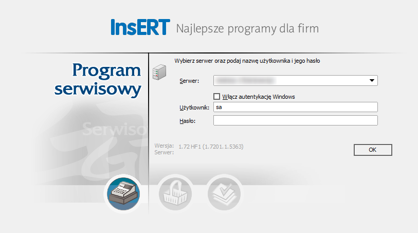 2. Zalogować się do programu. Domyślne dane logowania to użytkownik: sa, bez hasła.