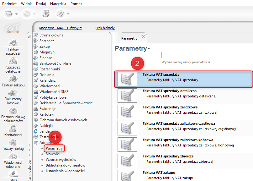 1. Przejść do modułu Administracja – Parametry i otworzyć dany typ dokumentu (np. Faktura VAT sprzedaży).