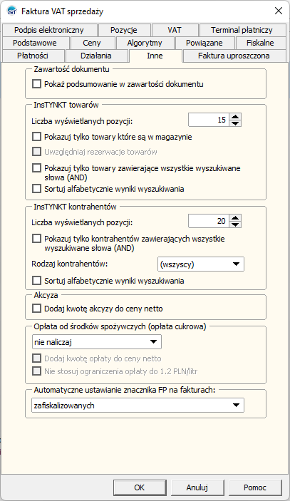 2. Na zakładce Inne sprawdzić konfigurację InsTYNKTu towarów i InsTYNKTu kontrahentów. Warto zwrócić uwagę na ustawienie Pokazuj towary zawierające wszystkie wyszukiwane słowa (AND).