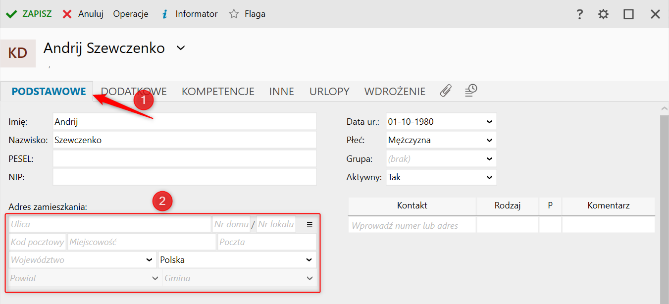 1. Będąc na kartotece pracownika uzupełnić Adres zamieszkania znajdujący się na zakładce Podstawowe.
