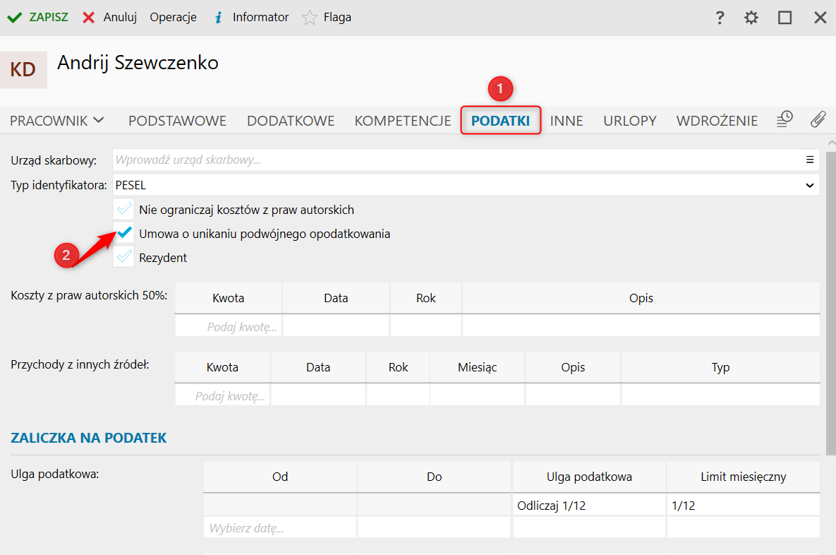 3. Przejść na zakładkę Podatki zaznaczyć Umo​wę o unikaniu podwójnego opodatkowania.