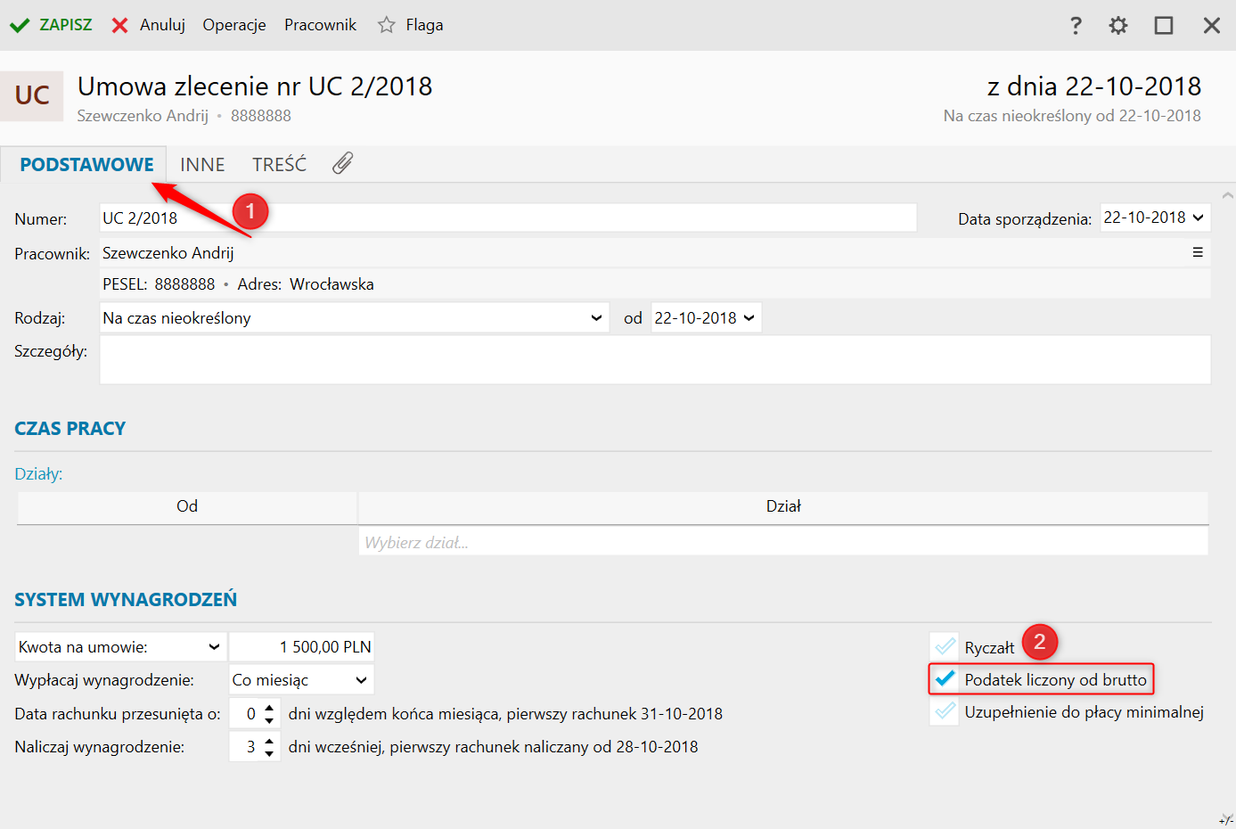 4. Na umowie cywilnoprawnej dla tego obcokrajowca należy na zakładce Podstawowe w sekcji System wynagrodzeń zaznaczyć Podatek liczony od brutto.