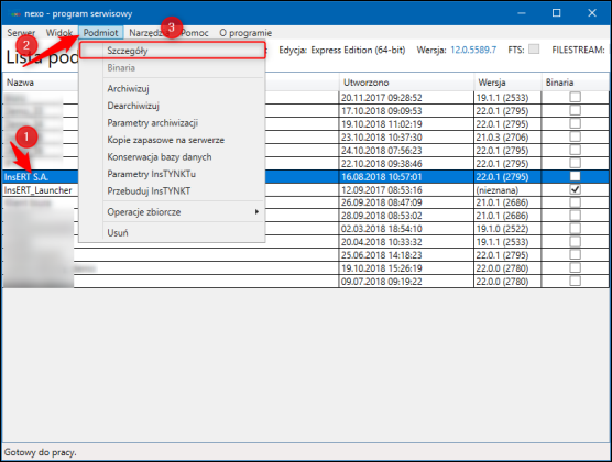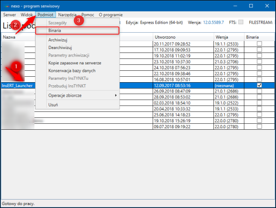 4. Zaznaczyć bazę InsERT_Launcher, następnie kliknąć górne menu Podmiot – Binaria.