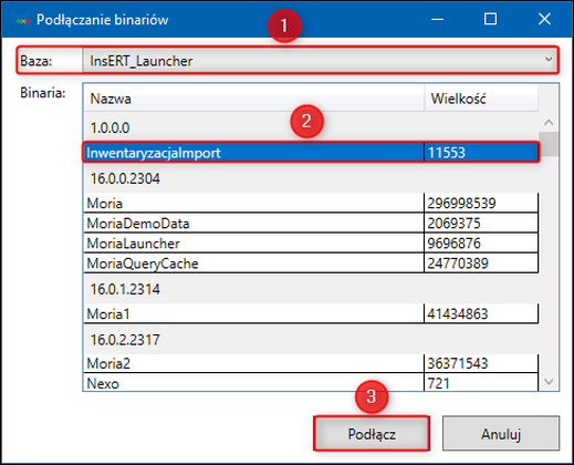 10. Parametr Baza ustawić na InsERT_Launcher, następnie w sekcji Binaria zaznaczyć dodane rozwiązanie i kliknąć Podłącz.