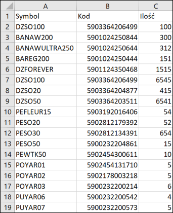 Kolejnym krokiem jest stworzenie odpowiedniego plik CSV, w którym znajdą się towary do wczytania. W tym celu można skorzystać z przykładowego pliku, który znajduje się w katalogu Dane lub stworzyć własny plik o stałej strukturze (np. symbol;kod;ilość).