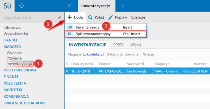 1. W programie Subiekt nexo przejść do modułu Inwentaryzacja, następnie kliknąć górne menu Dodaj – Spis inwentaryzacyjny.