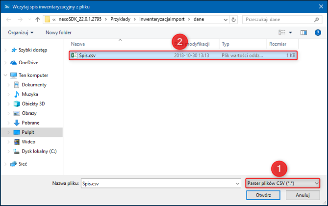 Program Subiekt nexo PRO umożliwia wyczytywanie spisu inwentaryzacyjnego z wcześniej przygotowanego pliku CSV. W tym celu w pierwszej kolejności należy przygotować odpowiednie rozwiązanie. Przykładowy projekt został zamieszczony w SDK, w folderze Przyklady – InwentaryzacjaImport. Wykorzystanie przykładu wymaga jego wcześniejszej kompilacji – w tej kwestii zalecamy kontakt z informatykiem bądź serwisantem.