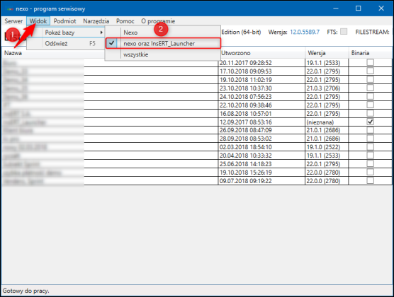 3. Z górnego menu Widok wybrać Pokaż bazy i zaznaczyć nexo oraz InsERT_Launcher.
