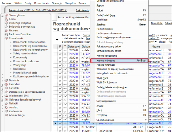 Najlepszym sposobem weryfikacji jest historia rozliczenia rozrachunku, w której można sprawdzić czym rozliczono rozrachunek oraz podejrzeć samą spłatę i jej walutę. Aby otworzyć historię rozliczenia, należy kliknąć prawym przyciskiem myszy na rozrachunku walutowym i wybrać opcję Historia rozliczenia.